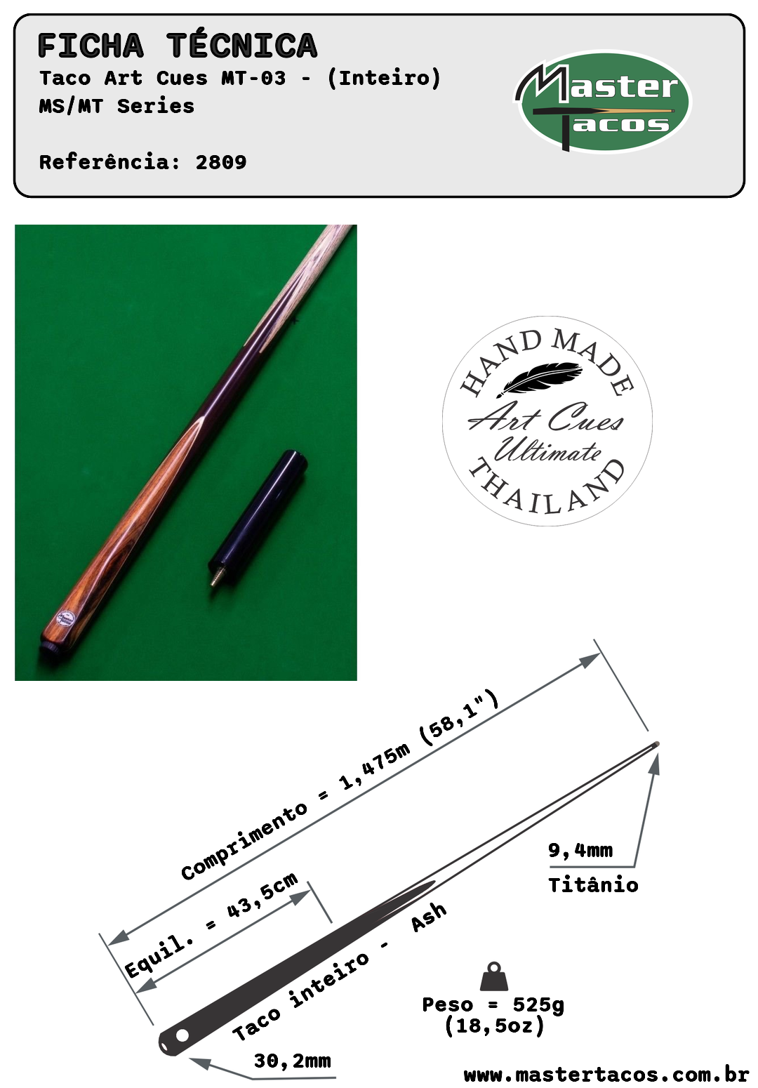 Taco ART Cues MT Series - Série de tacos especialmente fabricada para a Mastertacos sob medida para o gosto do jogador brasileiro!