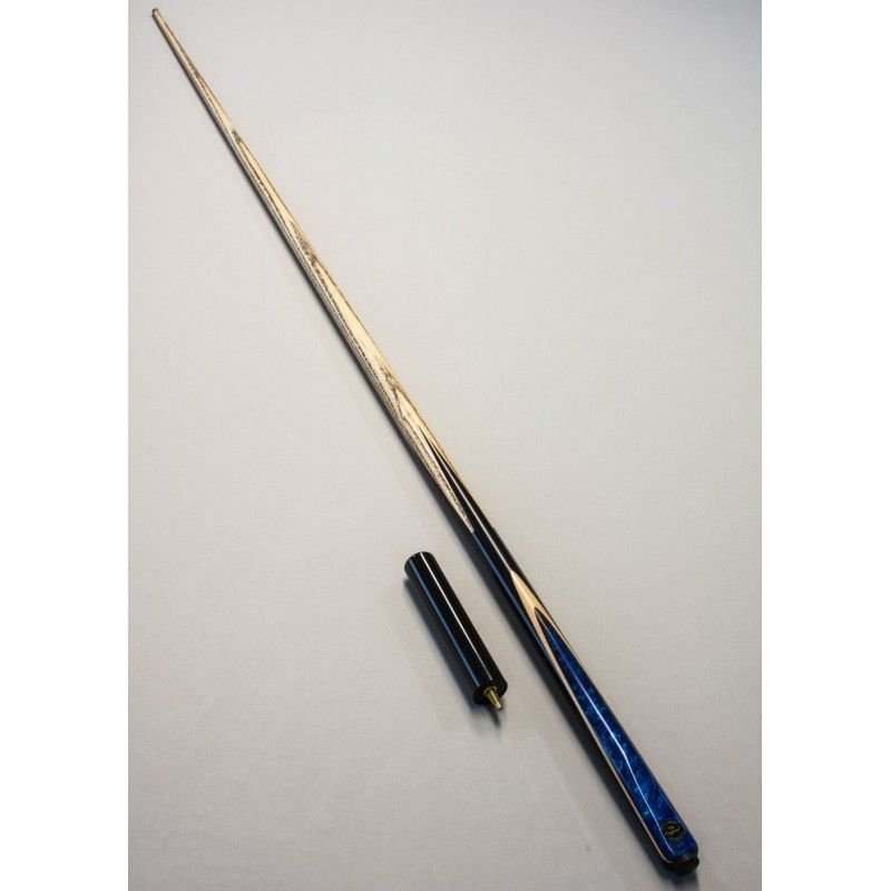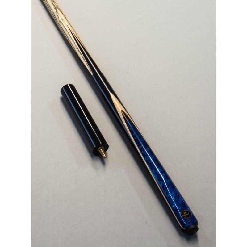 Taco inteiriço (one piece) com ponteira em madeira ASH e cabo em Ébano Macassar (preto/marrom) e detalhe em Maple e Resina Azul, combinando beleza, equilíbrio e performance profissional.