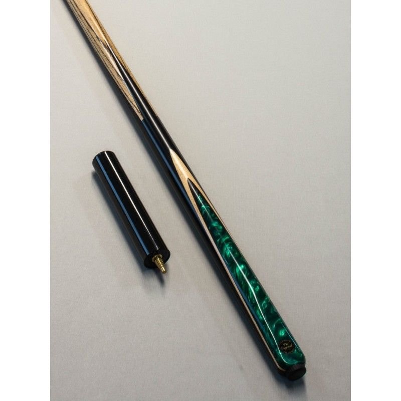 Taco inteiriço (one piece) com ponteira em madeira ASH e cabo em Ébano Macassar (preto/marrom) e detalhe em Maple e Resina Verde, combinando beleza, equilíbrio e performance profissional.