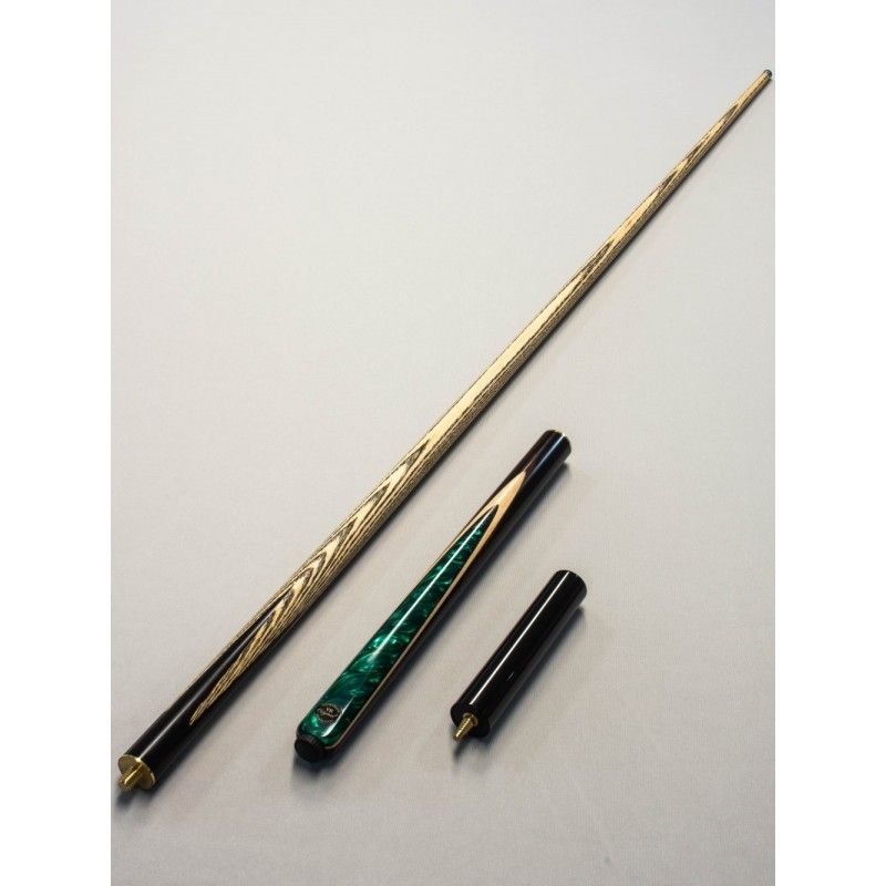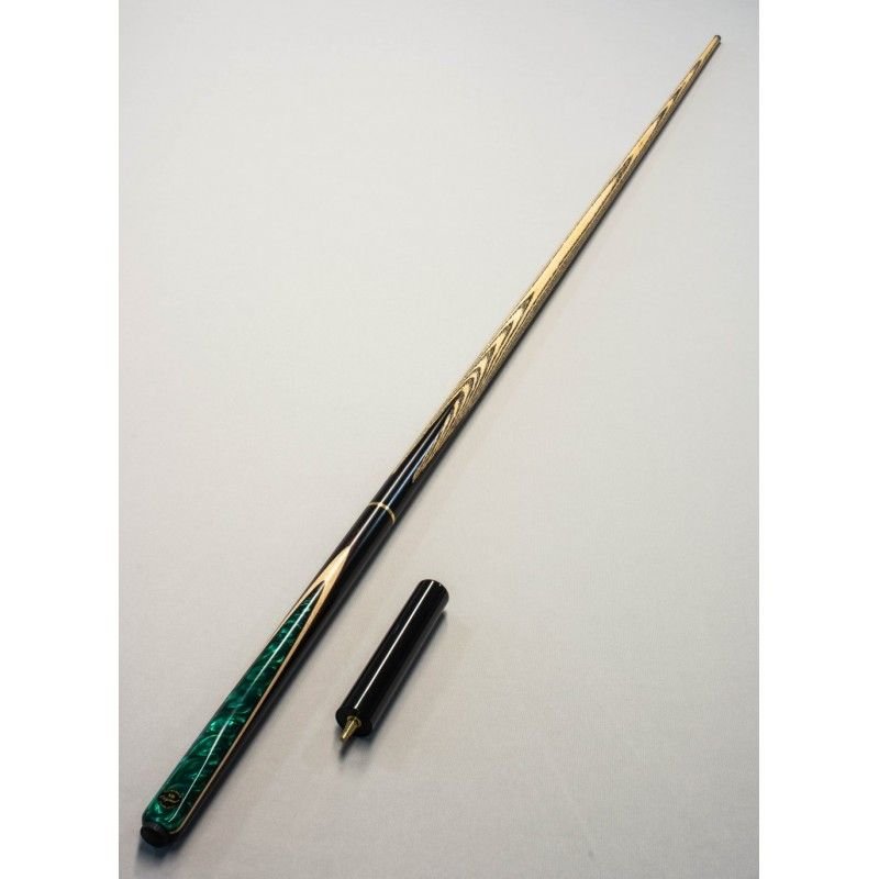 Taco inteiriço (Emenda com rosca em 3/4) com ponteira em madeira ASH e cabo em Ébano Macassar (preto/marrom) e detalhe em Maple e Resina Verde, combinando beleza, equilíbrio e performance profissional.