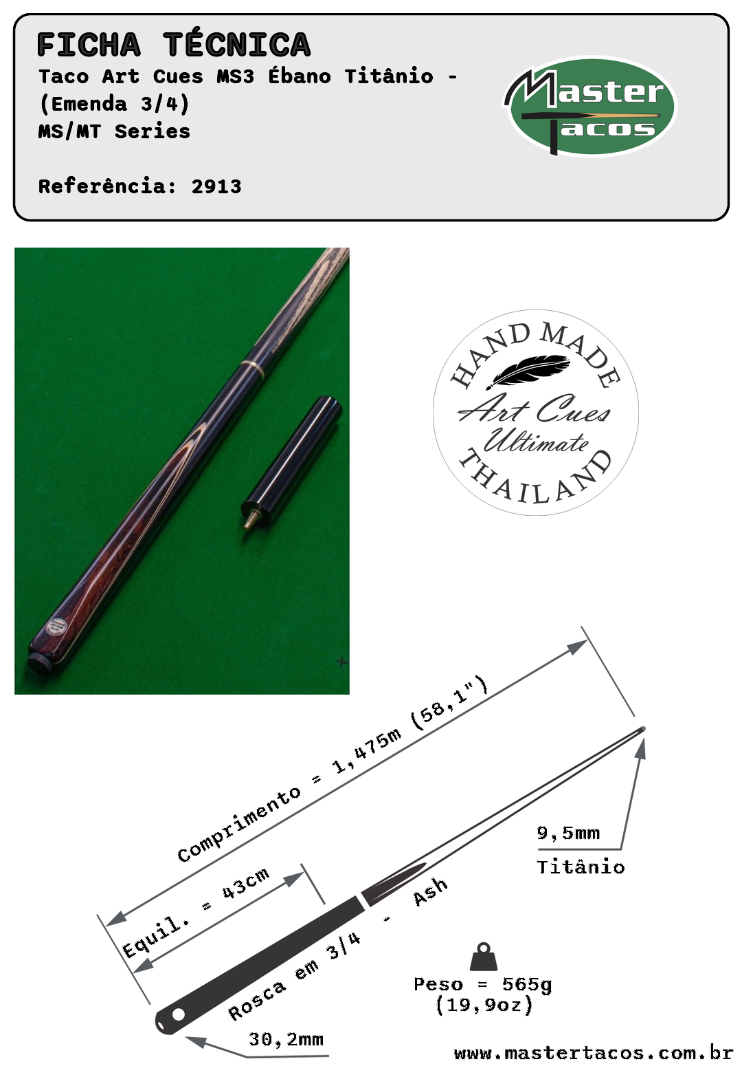 Taco ART CUES série Machine Spliced - (Emenda 3/4) com ponteira em madeira ASH, cabo garfado em madeira ébano africano legítimo e detalhe marchetado.