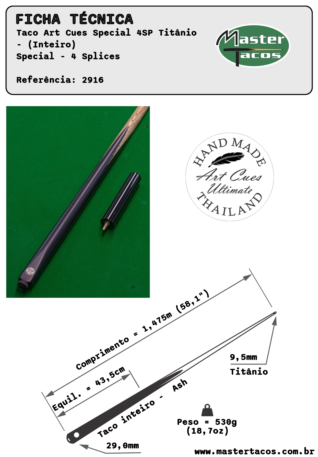 Taco ART CUES série SPECIAL - (Inteiro, sem emenda) com ponteira em madeira ASH selecionada, e cabo garfado em madeira ébano africano legítimo.