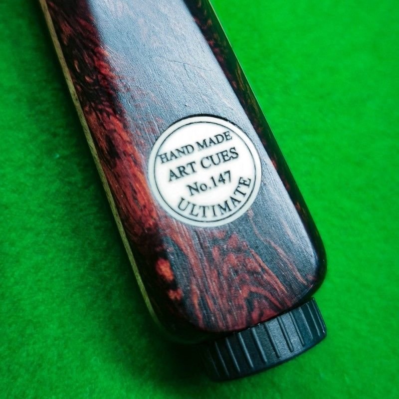 Taco ART CUES série ULTIMATE - (Inteiro, sem emenda) com ponteira em madeira ASH selecionada, e cabo garfado em madeira ébano africano legítimo e detalhe em Curly Maple e Lava Wood.