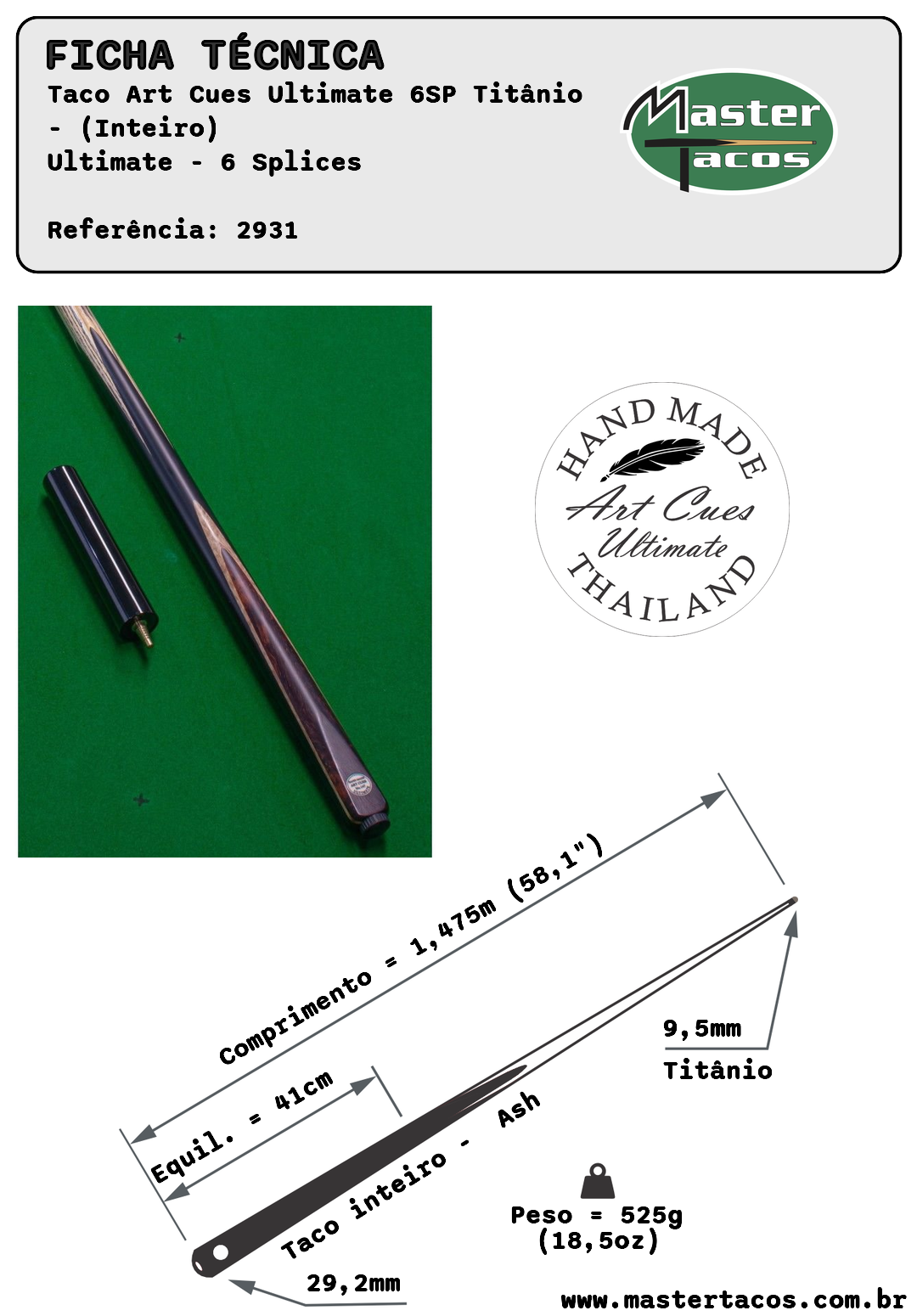 Possui ponteira em madeira norte-americana ASH, reconhecida pela excelente resposta nas tacadas, e cabo em Ébano Africano, uma madeira nobre e elegante em tons de preto e marrom.