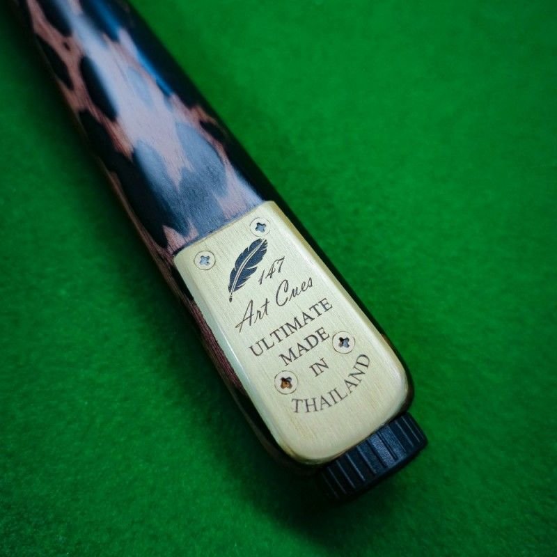 Taco ART CUES série ULTIMATE - (Inteiro, sem emenda) com ponteira em madeira ASH selecionada, e cabo garfado em madeira ébano africano legítimo e detalhe em Snake Wood e Leopard Wood.
