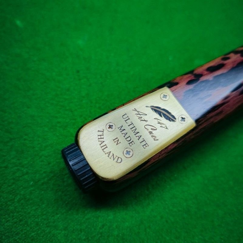 Taco ART CUES série ULTIMATE - (Inteiro, sem emenda) com ponteira em madeira ASH selecionada, e cabo garfado em madeira ébano africano legítimo e detalhe em Snake Wood e Leopard Wood.