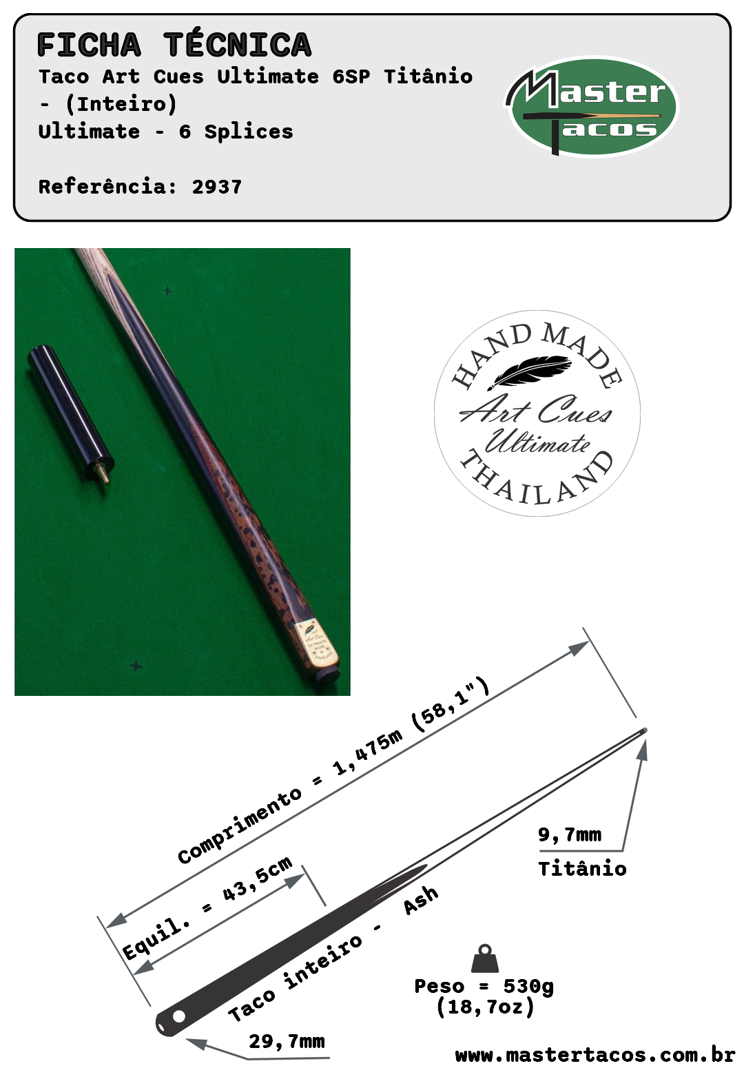 Possui ponteira em madeira norte-americana ASH, reconhecida pela excelente resposta nas tacadas, e cabo em Ébano Africano, uma madeira nobre e elegante em tons de preto e marrom.