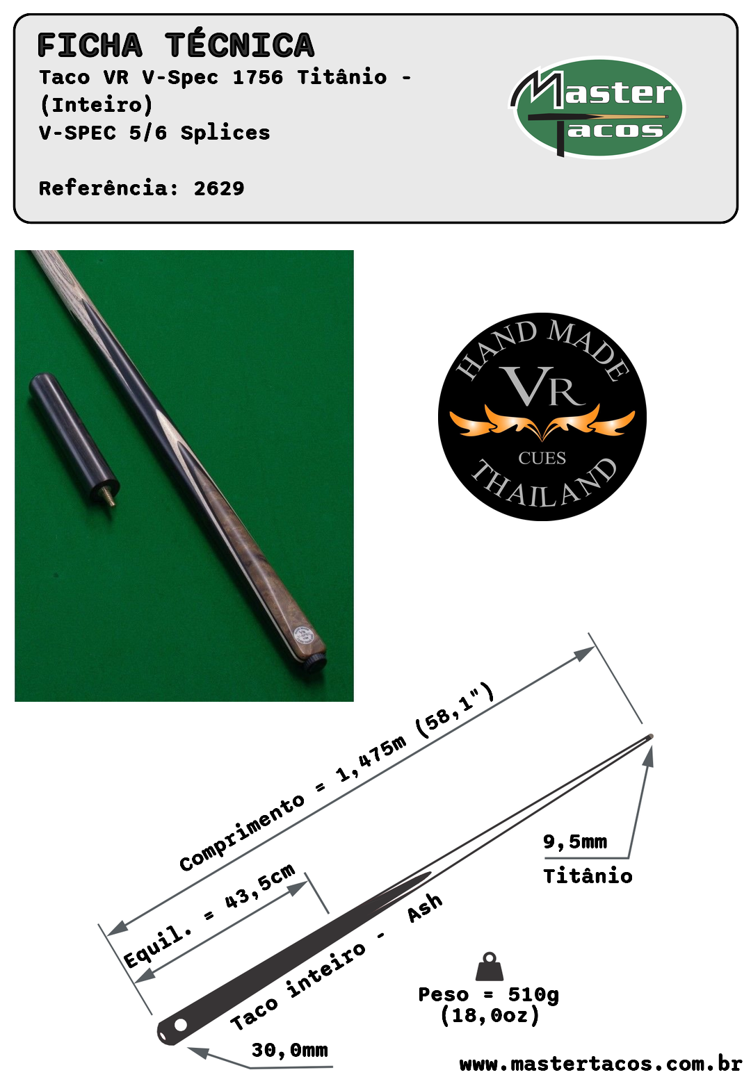 Taco VR V-SPEC 1756 - (Inteiro) com ponteira em madeira ASH, cabo em Ébano Africano Legítimo maciço, com detalhe em Maple e Tuya Burl.